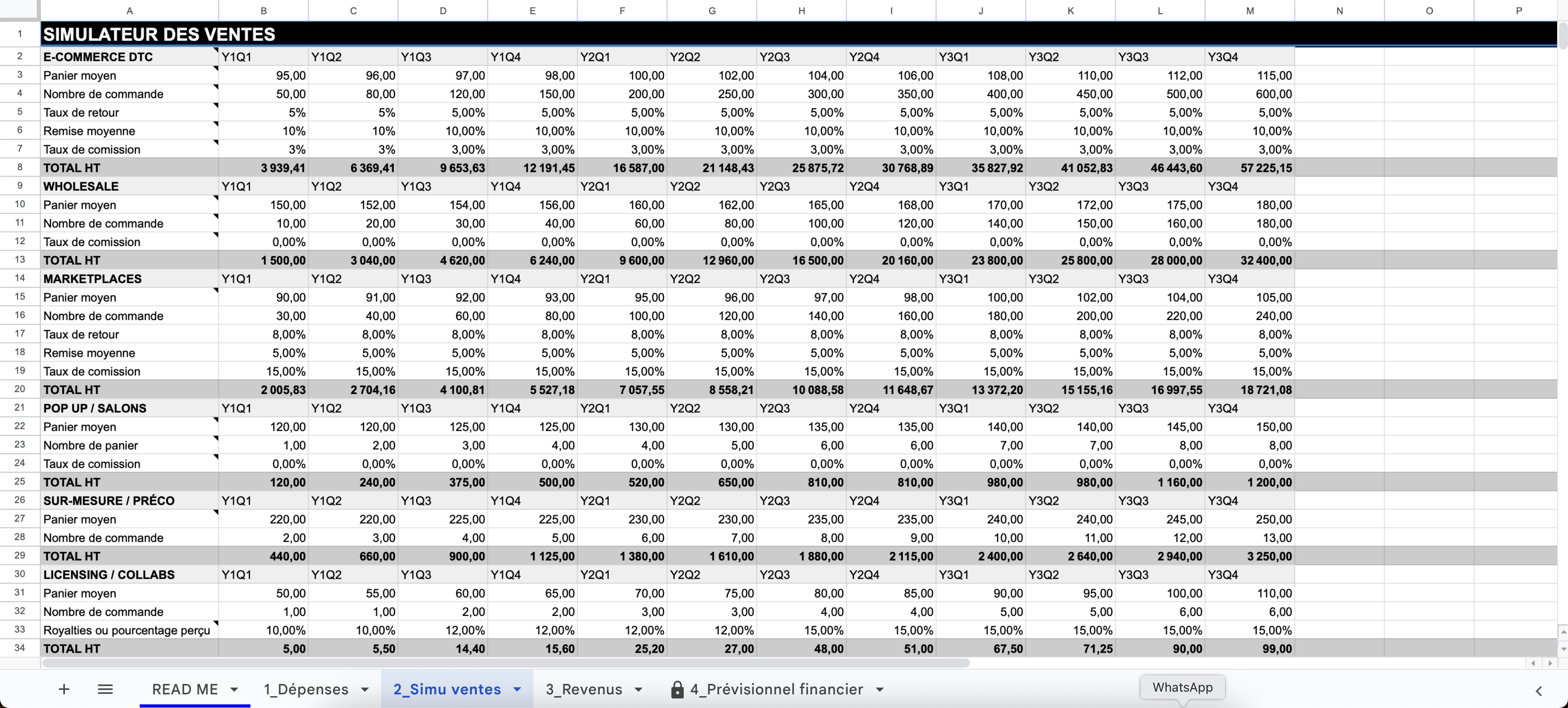 Simulation des ventes prévisionnelles par canal avec différents facteurs de scénarios.